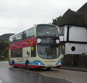 one of seven Wright bodied Volvos, is seen at Newton Poppleford.
