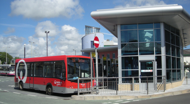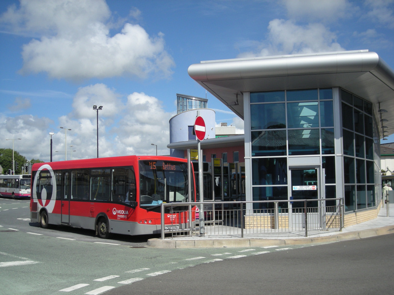 bodied Dennis Dart is seen in recently rebuilt Bridgend bus station.