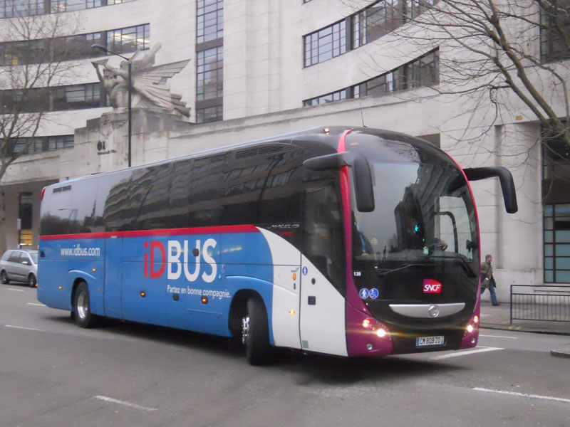 an idBus liveried Setra, is seen at London Victoria heading for Paris in