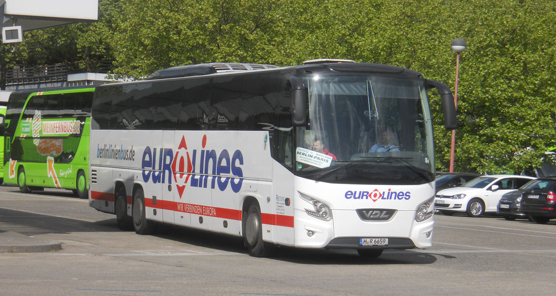 A VDL/Bova is seen leaving for Paris on the bum-numbing 1000km