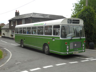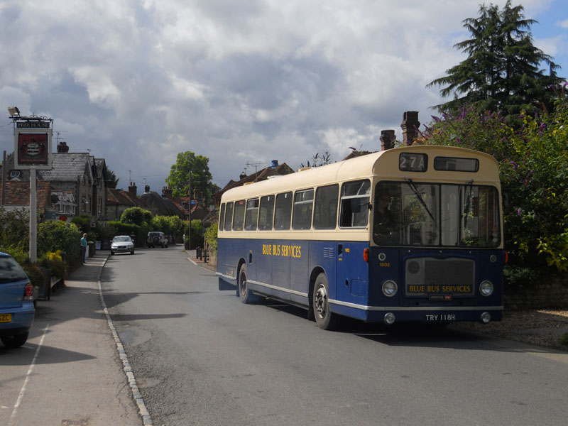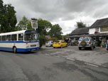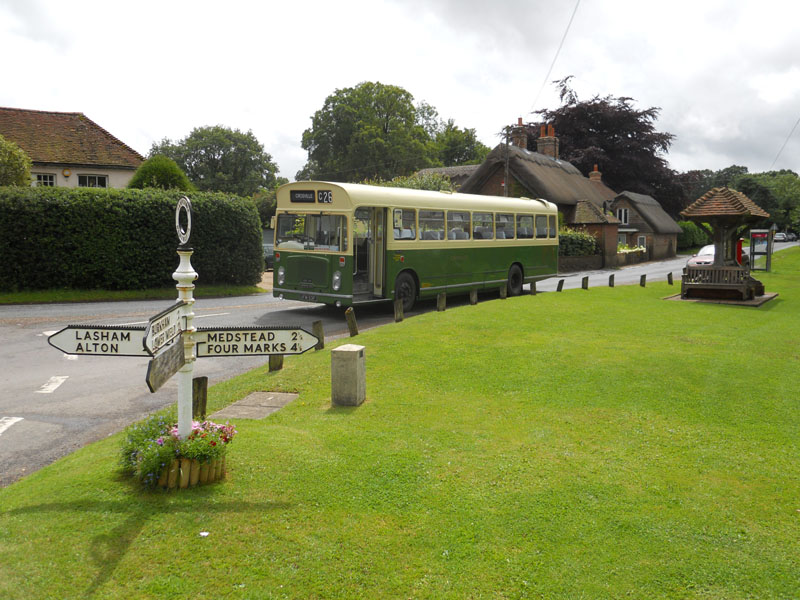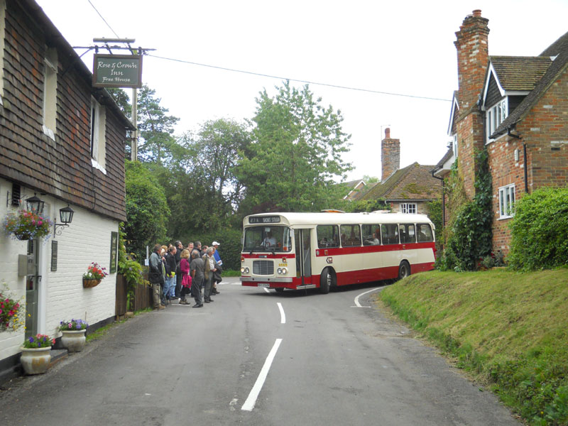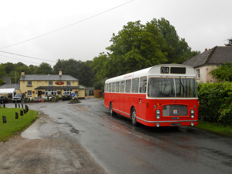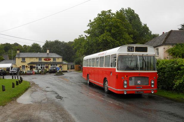 The Hants and Surrey Bristol RE Group organise an unusual event every summer. They invite owners of Bristol RE's to drive around pubs in Hampshire and Surrey, transporting willing enthusiasts who are not only interested in real buses, but also real ale. The event is impeccably organised, centred on Alton rail station, with timetables, maps and even specially erected sign posts (above left). The only dampener on proceedings can be the weather, which was certainly unseasonable in July 2011. Torrential rain fell all morning and even by lunchtime at the Star Inn at Bentworth (above) it was still fairly miserable for a Hants & Dorset RE. However conditions soon improved and in the early afternoon at the same location the sun popped out to welcome a Crosville RE (lower left 1). The day progressed with an Ulsterbus RE seen at the Castle of Comfort in Medstead (lower left 2). Precision timetabling meant there were opportunities to change vehicles at locations, such as the Selborne Arms where a Southern Vectis LH and a Blue Bus Services RE crossed paths (lower left 3 & 4). Near the end of the day when many travellers were rather jolly, an Eastern National RE and a Citybus RE are seen at the Rose & Crown pub in Upper Farringdon (lower left 5 & 6). There may still be revellers lost in deepest Hampshire waiting for that elusive final RE home. | |