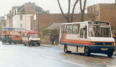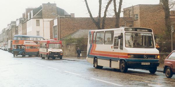Alexander bodied Mercedes minibus, followed by a Stathtay Dodge