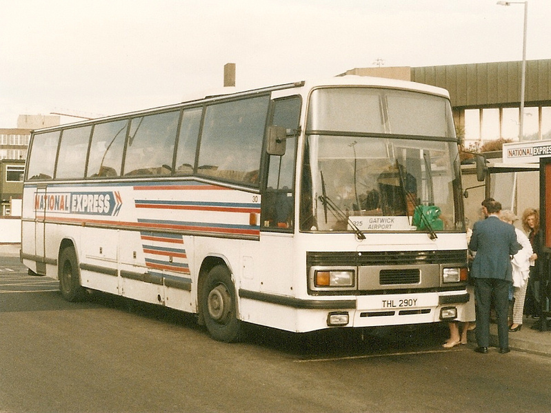 • Durham Travel Services30 (THL290Y), a Plaxton bodied Tiger in Sheffield bus station on National Express duty in October 1990.