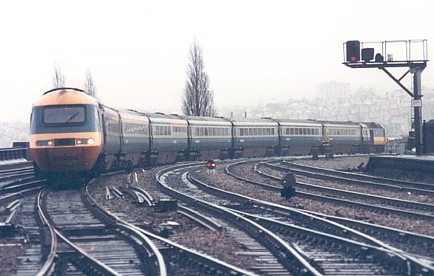 A British Rail HST approaches Newport railway station on a drab day in January 1984.